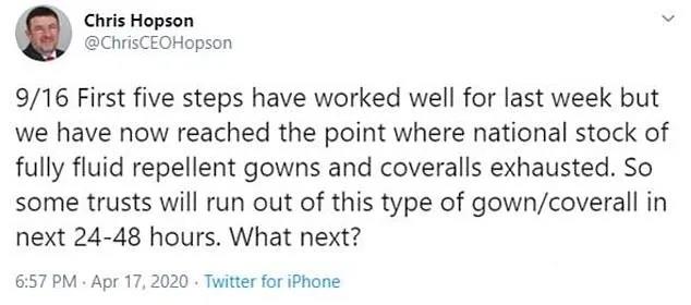 这一天,一件雪上加霜的事情发生了,PHE公开承认,医院的防护服将要告罄。 “在接下来的24或48小时内,防护服的库存将用尽。”