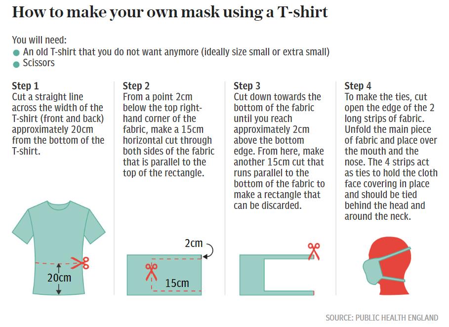 另外,需要注意的是,英国政府建议民众佩戴的口罩并非指医用级别口罩,而是指诸如围巾之类的面罩。因为医用口罩不够用,很多媒体甚至制作了专门的图来指导民众们自制口罩。