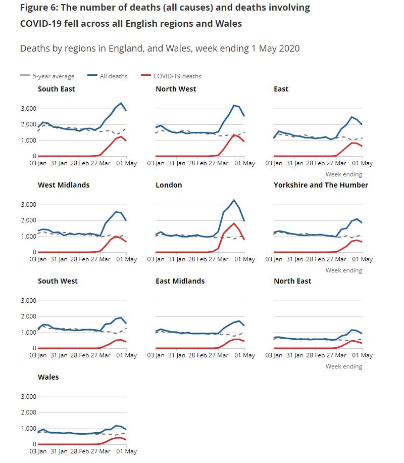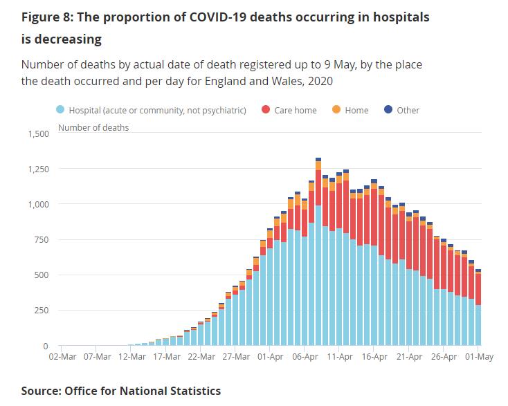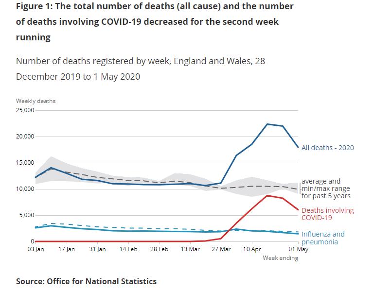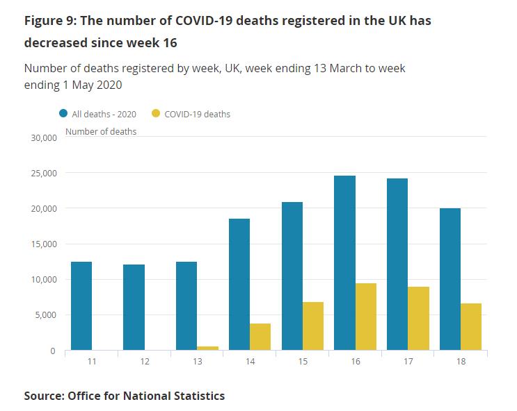 在截至5月1日的一周内,全英国有6,676人因新冠死亡,而前一周,英国因新冠死亡的人数为9,005人。