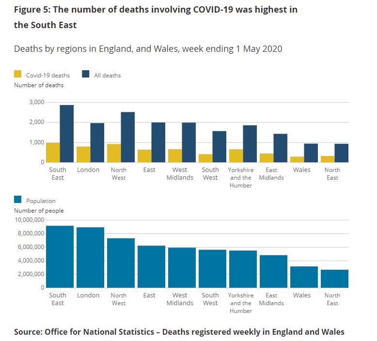 再从城市维度来分析,英格兰东南部首次超越伦敦,成为了英国因新冠病毒导致死亡人数最多的地区。