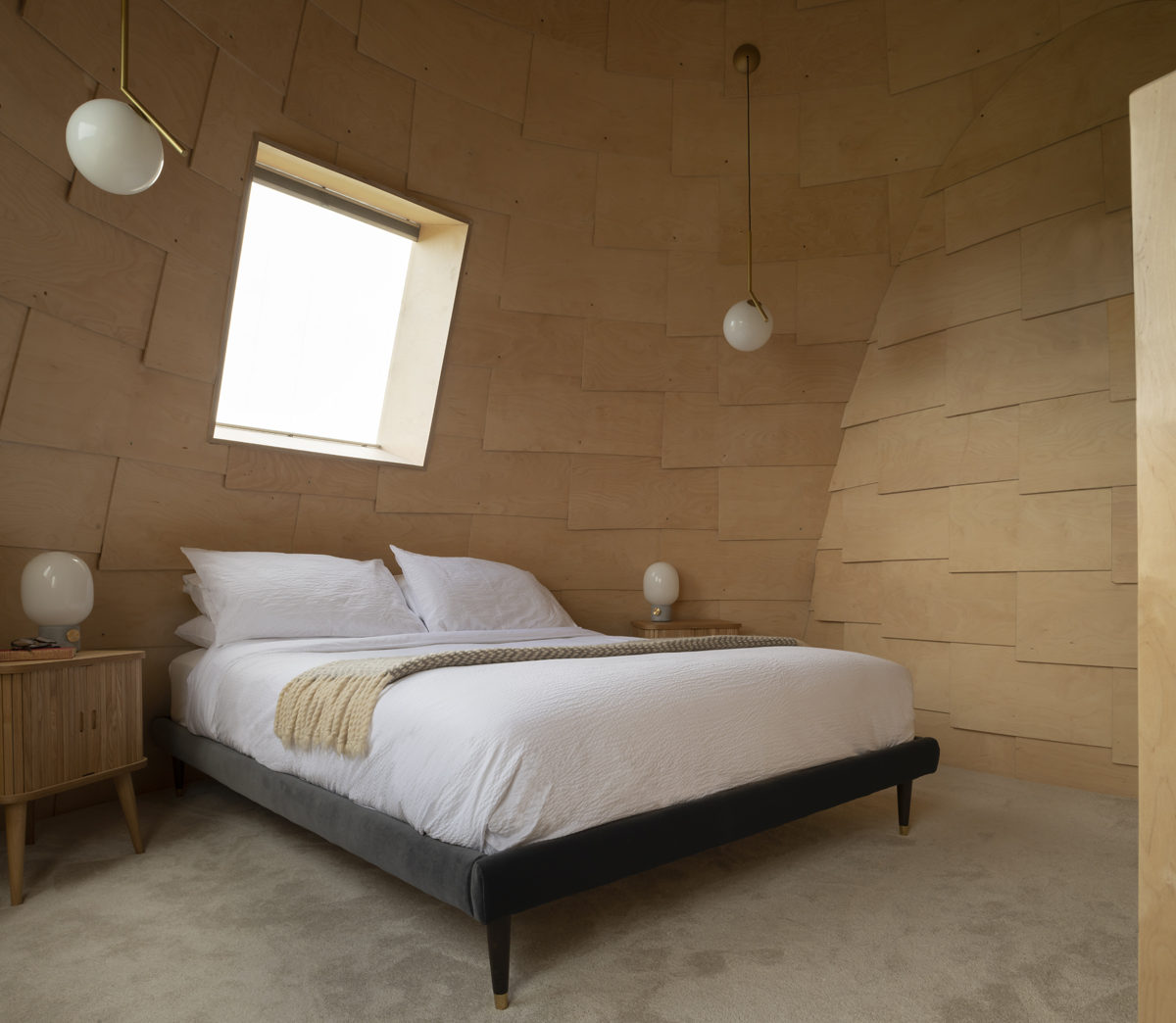 卧室基本都处于塔楼顶层,简单又不失精致。整个卧室的墙面全部用木片堆叠而成,很好的呼应了外部的设计。