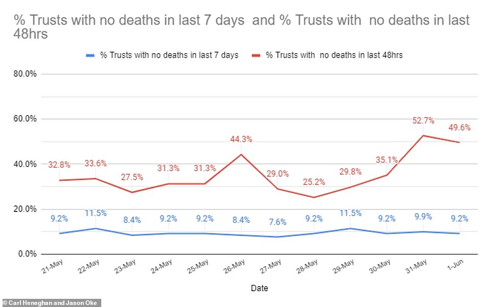 与此同时,数据显示,过去12周,英格兰有12家NHS医院信托(9.2%)没有因新冠肺炎而死亡的病例;而在过去48小时之内,英格兰有65家NHS医院信托(49.6%)没有因新冠肺炎而死亡的病例。