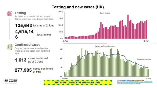 过去一天,英国检测了135,643次,新增确诊病例1,613人,累计确诊277,985人。
