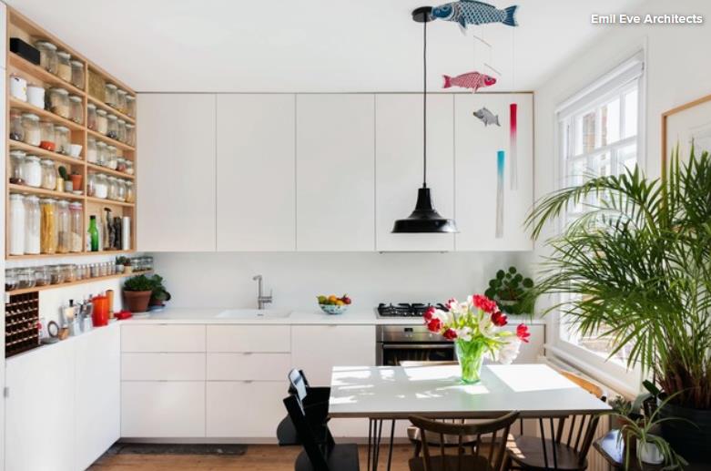 浅色系也有自己的“俏皮可爱”,把餐桌搬到厨房增加了额外的就餐空间。