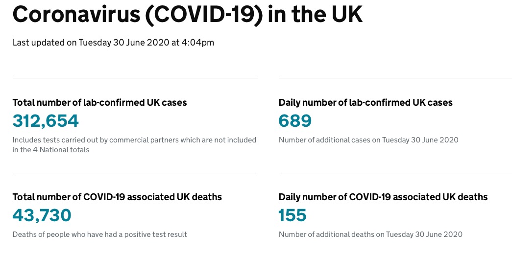 截至6月30日,英国新增确诊病例689人,累计确诊312,654人;新增死亡155人,累计死亡43,730人。