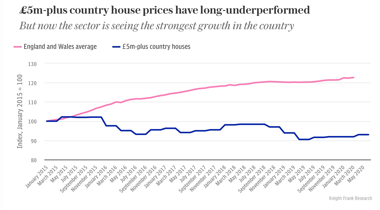 蓝线表示2015年-2020年近5年来500万英镑以上的乡村住宅价格走势;