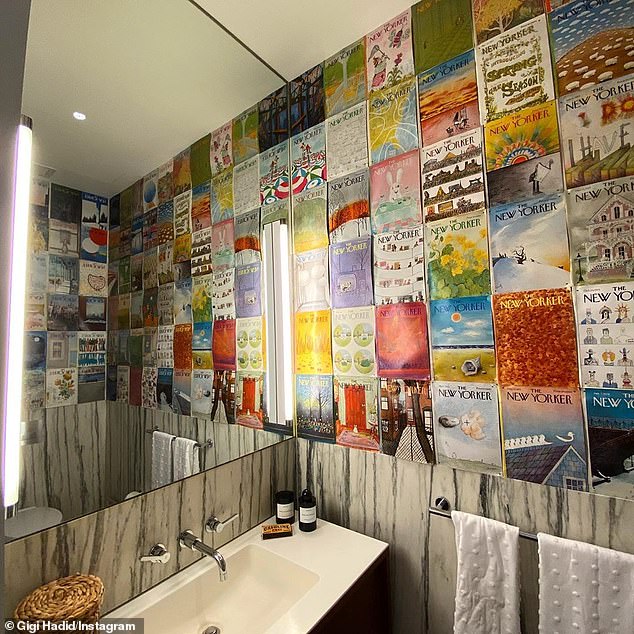 这间浴室由灰色和黑色条纹的大理石打造,墙壁上贴着很多《纽约客》杂志的封面图。