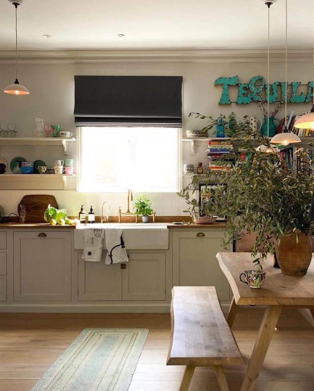 这间厨房使用了常见的白色壁柜,还有一张复古的木质餐桌,佐伊还在餐桌上摆放了一棵巨大的绿色植物,叶子从上面倾泻而下,优雅而美丽。