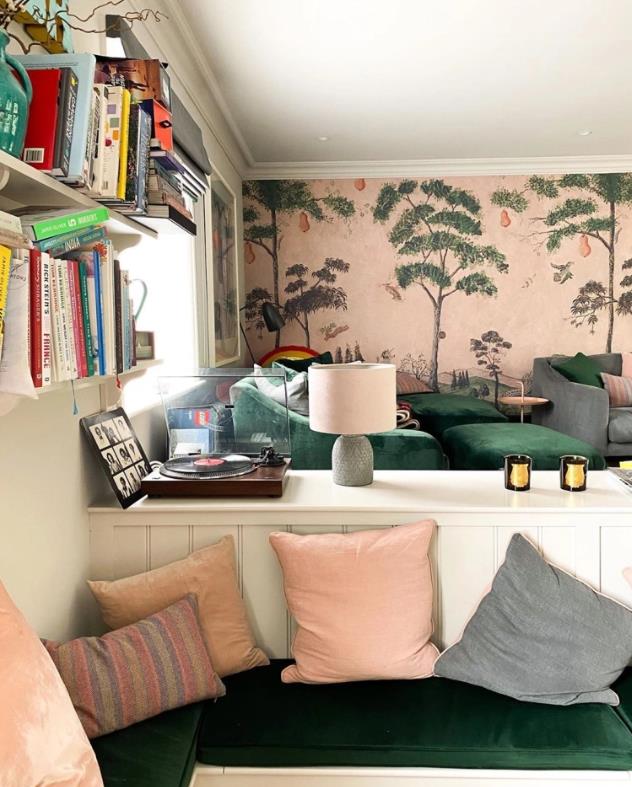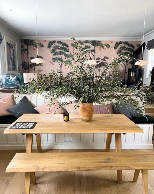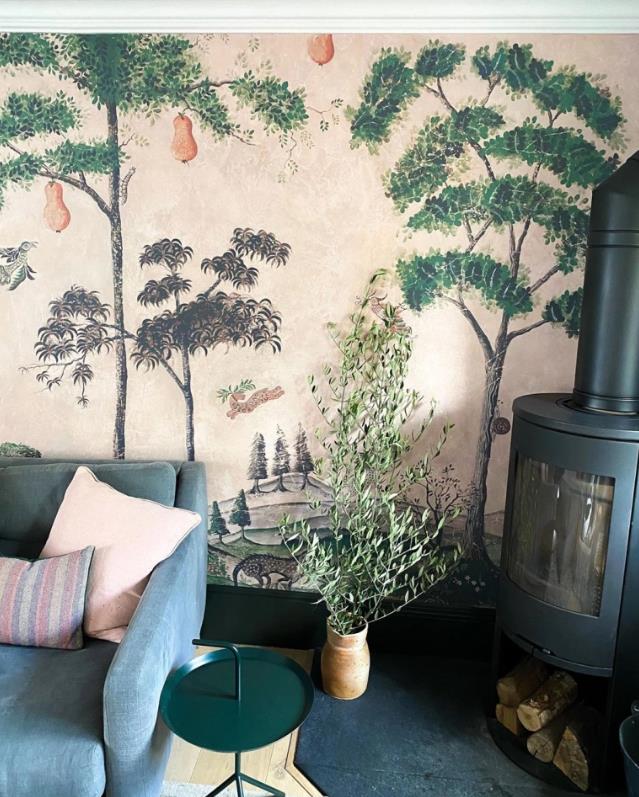 从上面的照片我们也可以发现,在餐厨区的旁边,就是这家人的客厅,佐伊非常大胆地运用了一款绿植壁纸作为装饰,而在壁炉的旁边,她也放置了一盆植物进行呼应。