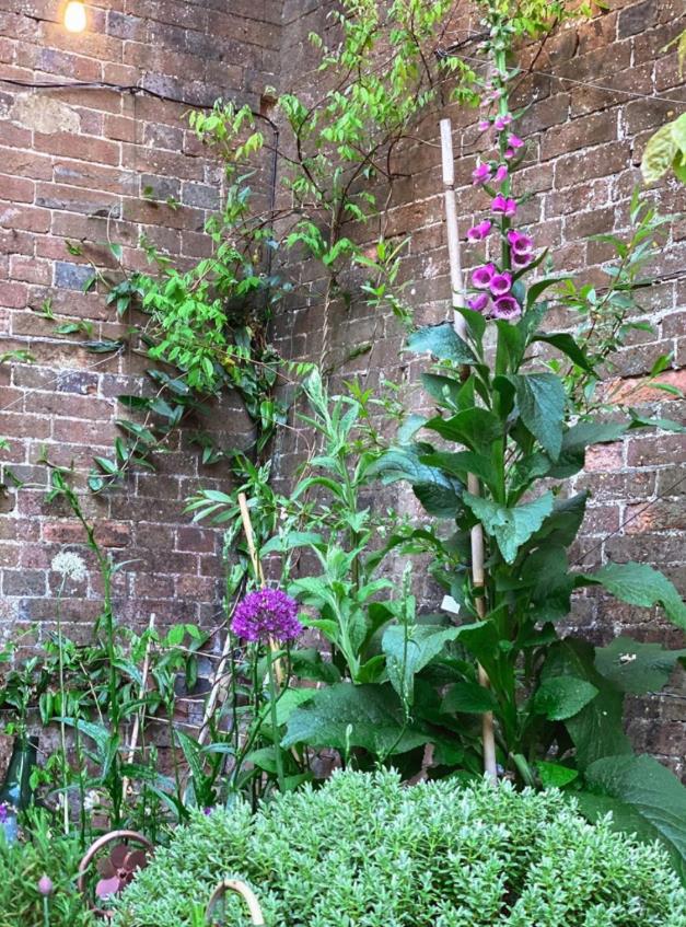 在院子的一角,绿植沿着红色的砖墙攀爬,几多颜色鲜艳的小花点缀其间,十分美丽~