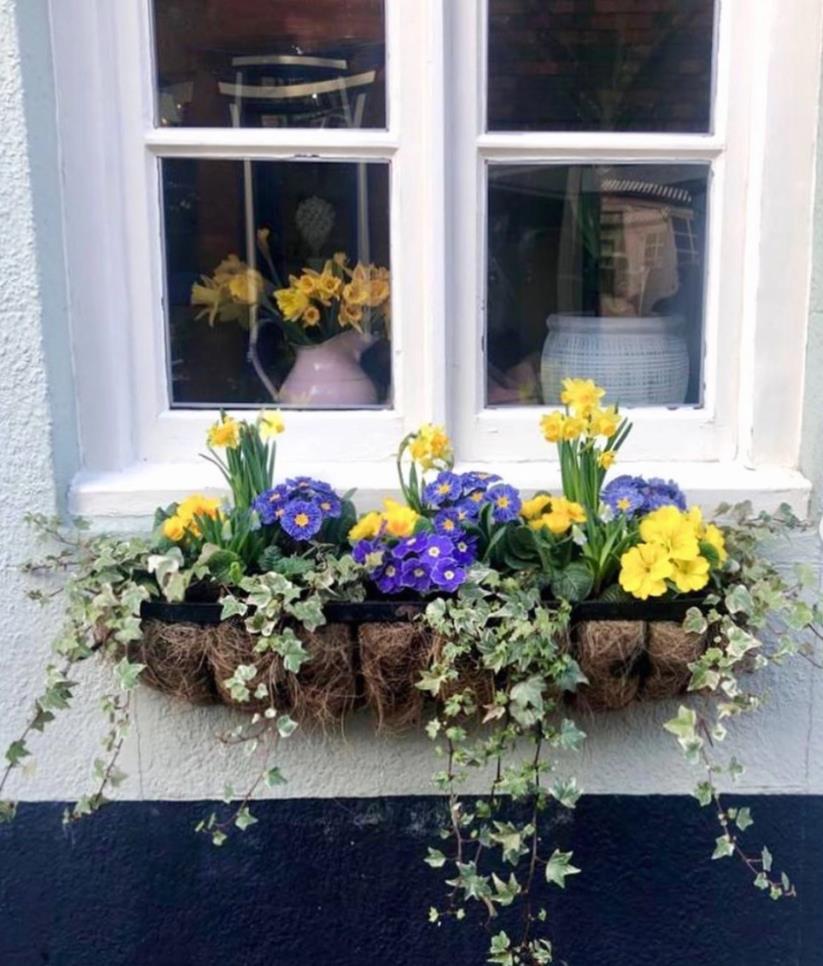 窗户上也放置了专门的植物盒,种上了绿植和花朵。