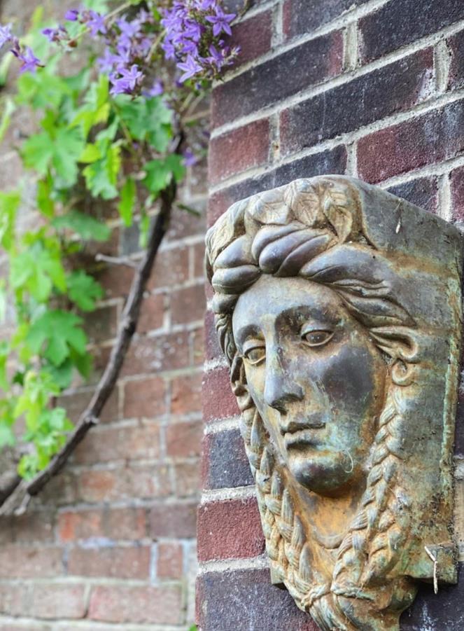 除了琳琅满目的绿植和花朵,佐伊还在院子里增添了许多特色的装饰,比如,独特的人脸石头雕塑。