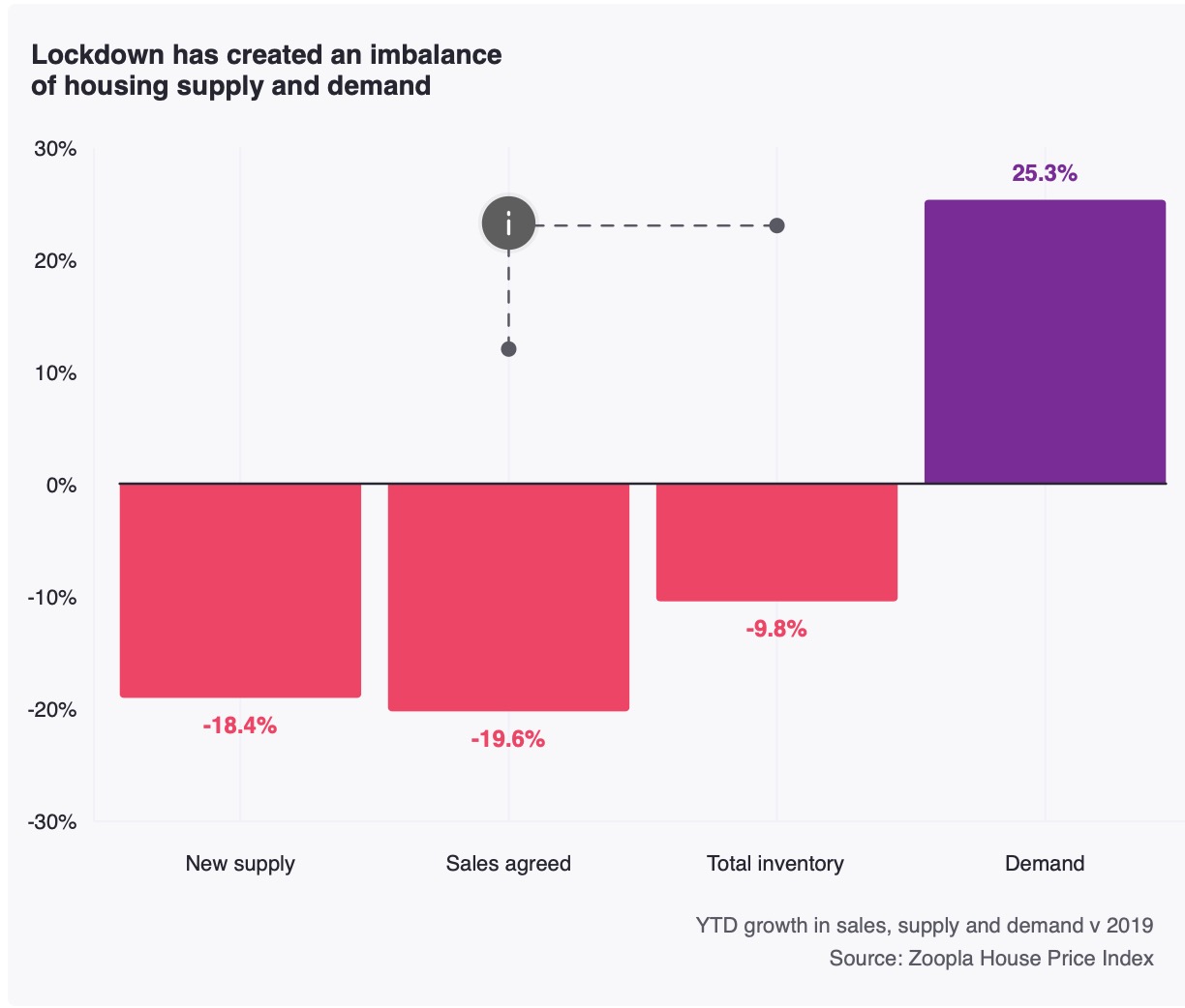 Zoopla近期数据显示:英国的住房需求已经反弹并超过市场封锁前的水平,截止目前,房产需求量比3月初高出46%,是2019年6月的1.5倍。