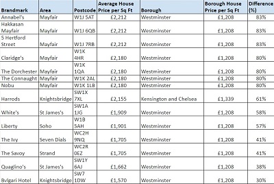 该研究涵盖了伦敦的餐厅、俱乐部、酒店、购物中心等20个知名品牌,比如,Annabel’s,Harrods、Claridge’s等,在对比了这些品牌附近地区的房价和更广阔区域的房价后发现: