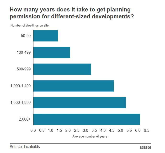 房地产咨询公司Lichfields的研究发现:英国各大住宅发展项目在获得规划许可时都需要较长的年限,尤其是交付的住宅数量越多,需要的年限越久。