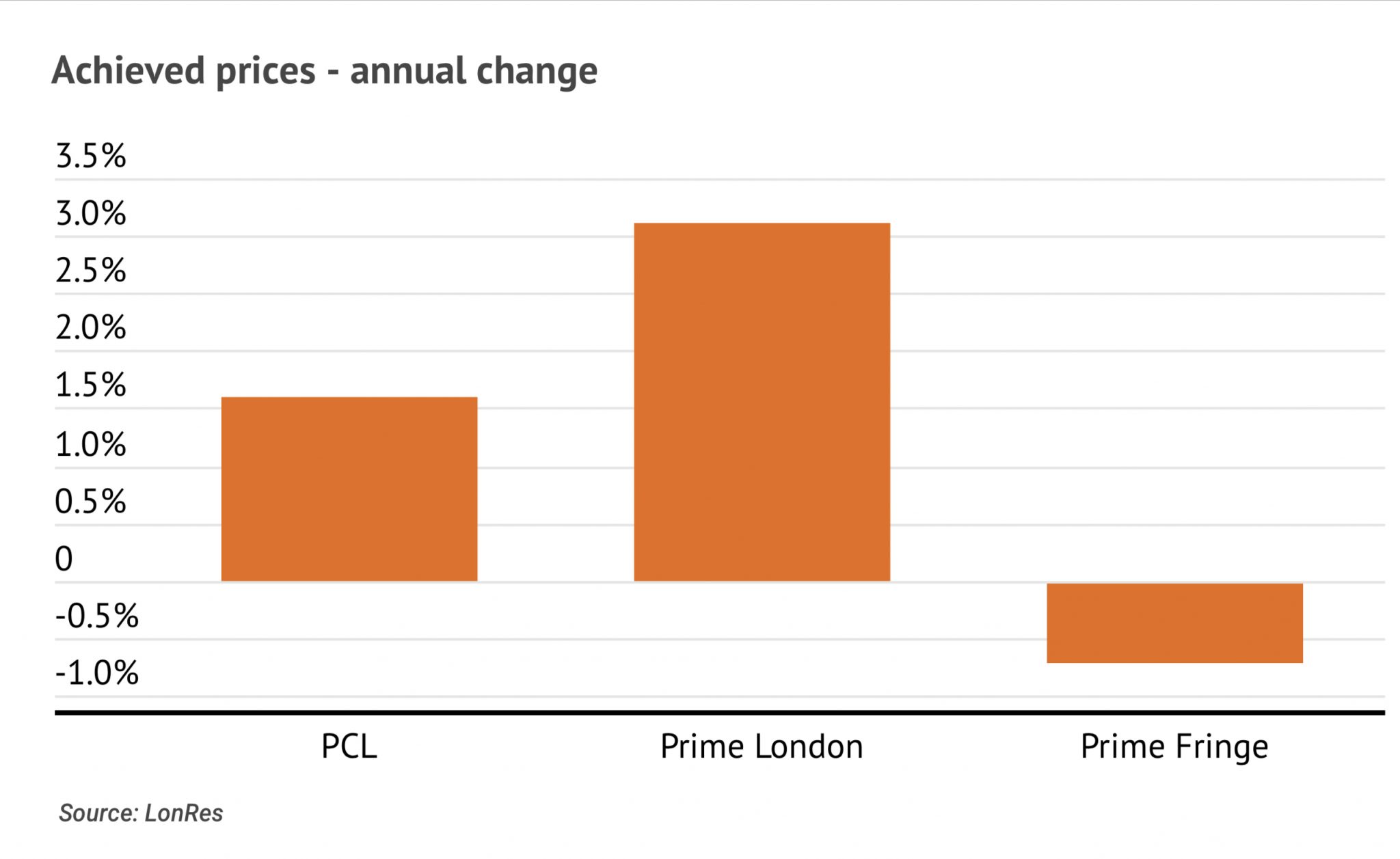 ● 据LonRes调查发现,伦敦市中心(PCL)和伦敦黄金地段(Prime London)的房价都出现了不同程度增长,房价较去年同期分别增长了1.6%和3.1%。