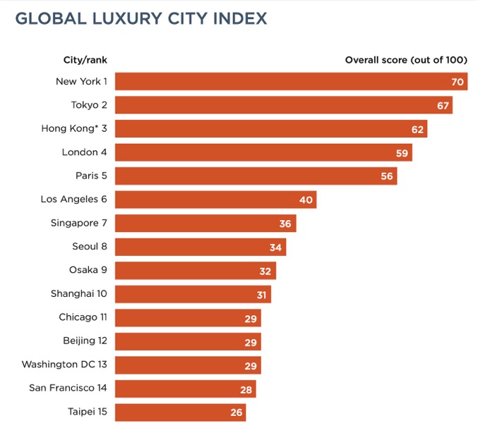排名基于一系列指标,包括:超高净值和超净值人口的目前规模(以及未来五年的预测);高端时尚、手表、珠宝品牌店面数量和质量;以及高档餐厅、五星级酒店和赌场的数量等。