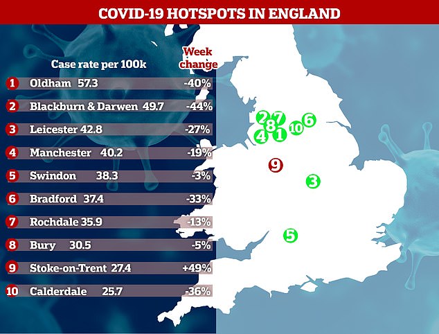 NHS数据显示:过去一周,英格兰每10万人感染率最高的10个地区中,有9个地区感染率在下降,唯一没下降反而上升的地区是Stoke-on-Trent。