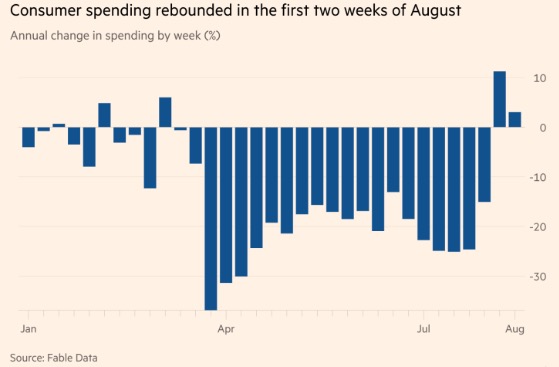 Fable Data的数据显示:8月的前两周,包括休闲活动在内的总消费支出超过了去年同期,这是今年3月封锁以来,支出首次出现年度增长!