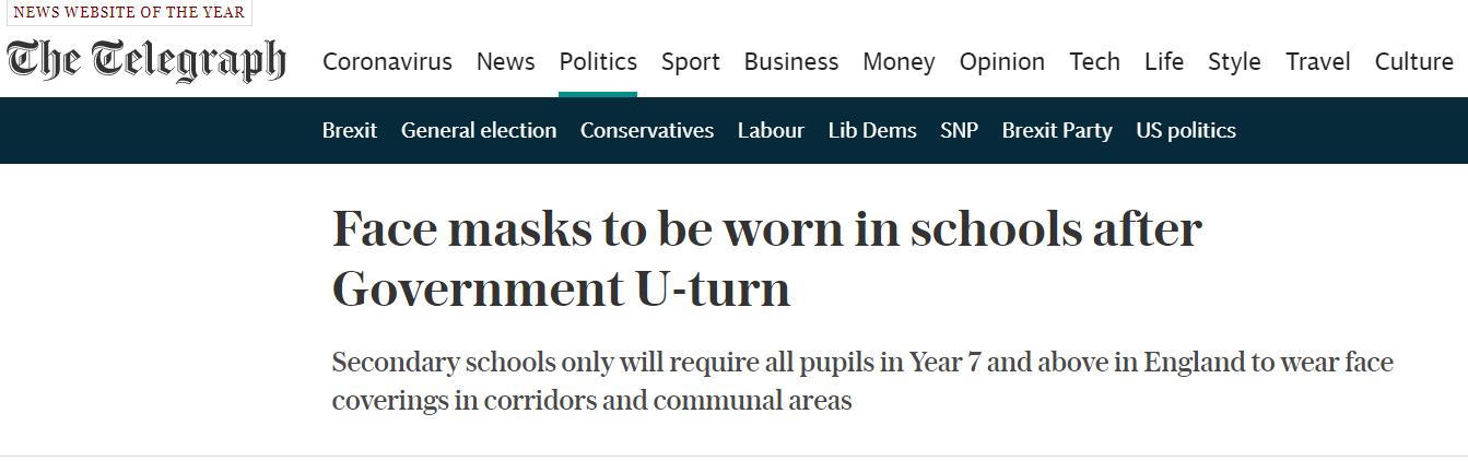 当时,英国政府的科学顾问给出的理由是,让年龄更小的儿童戴口罩,实际上可能会增加他们传播病毒的几率。