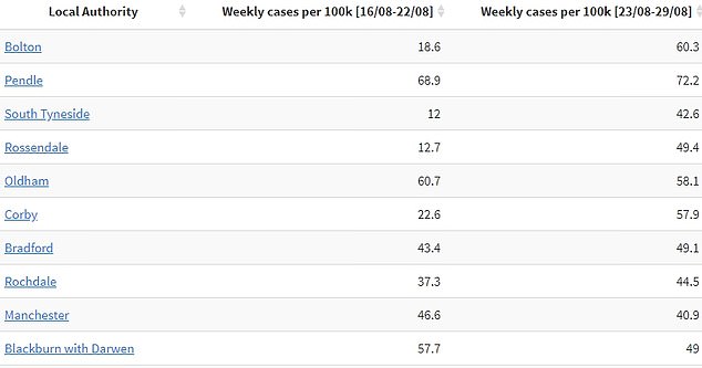 在9月13日到19日,还会出现10个高风险地区,包括South Tyneside 、Rossendale 、 Leeds、Corby 、 Breckland。