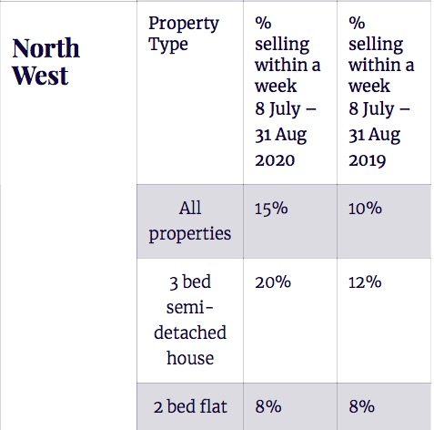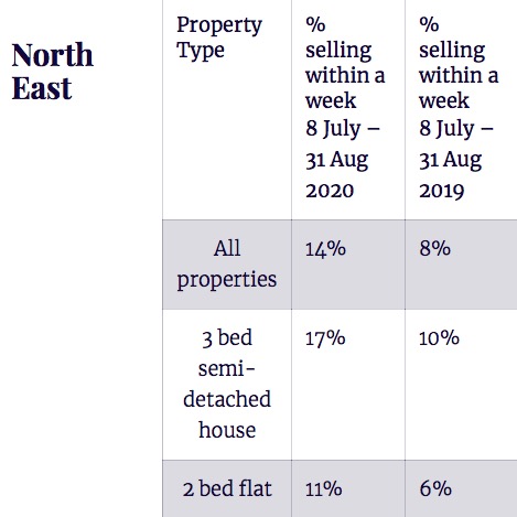 如下图所示:英国各地按房产类型划分,一周内售出的所有房产的比例,房产类型、一周内售出房产%(2020年7月8日- 8月31日)、一周内售出房产%(2019年7月8日- 8月31日)