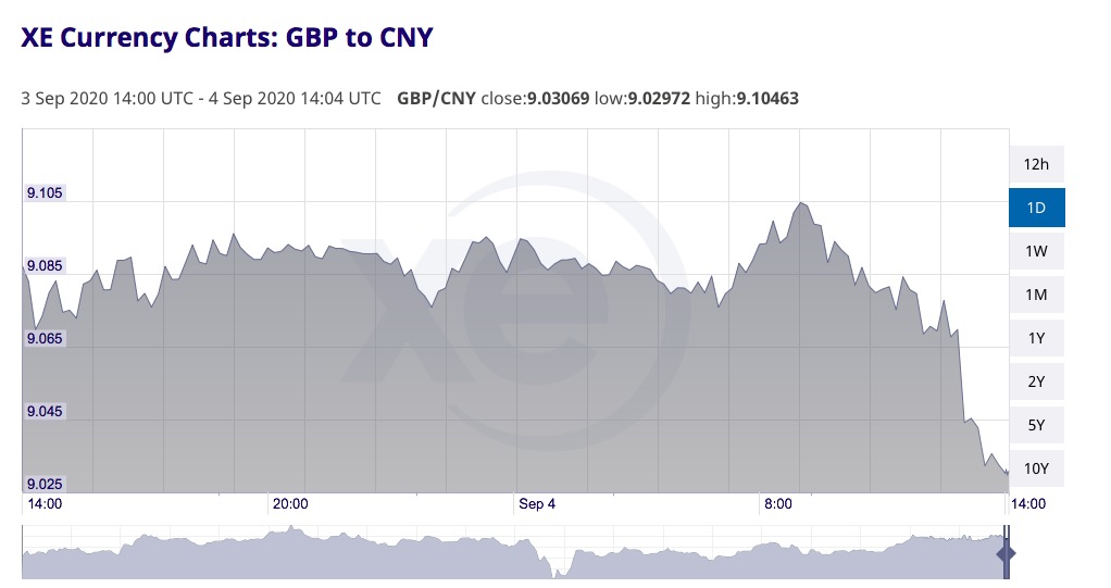 从昨天开始,英镑开始下跌,兑换人民币,从最初的九块一毛多,一路下跌到今天的9.03。