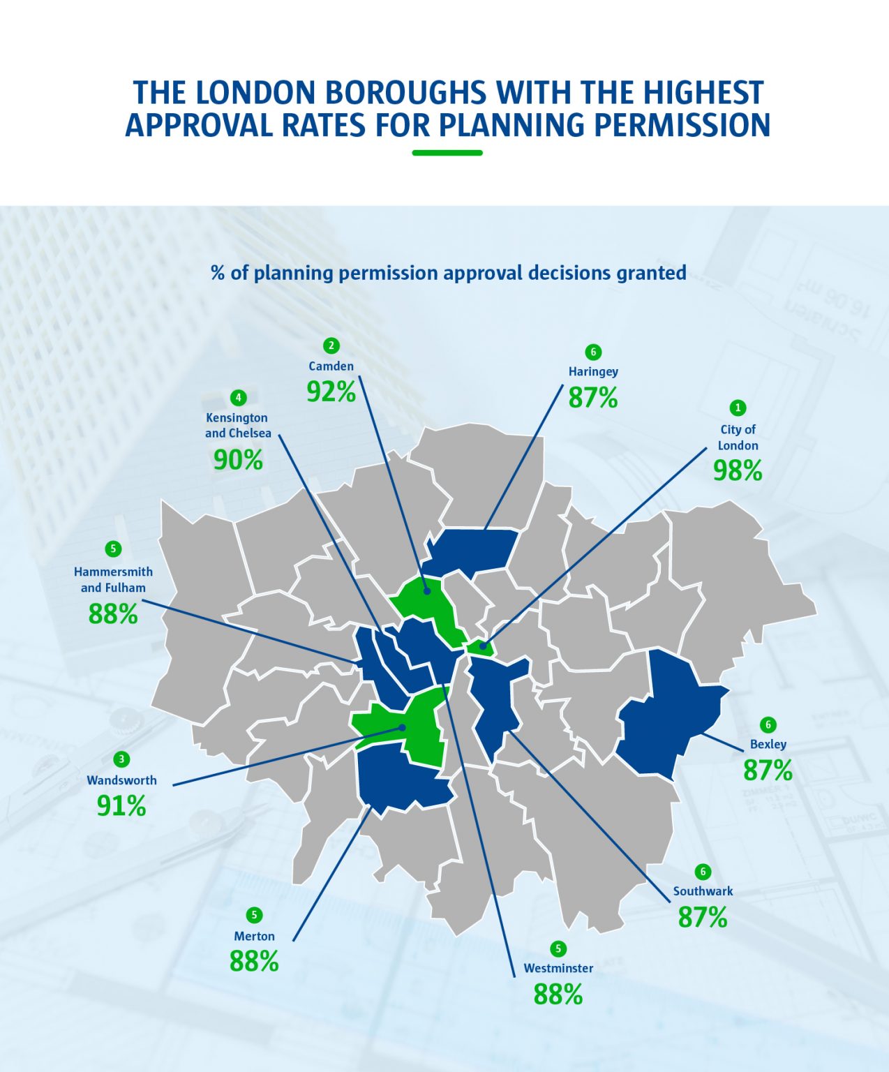 - 英国规划许可获批热点地区曝光:伦敦地区市中心最高,City of London达到98%。