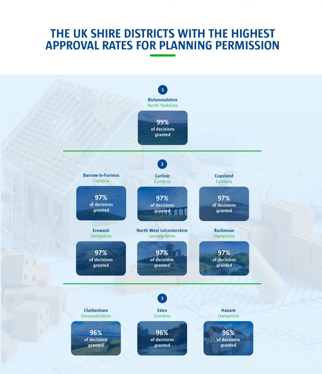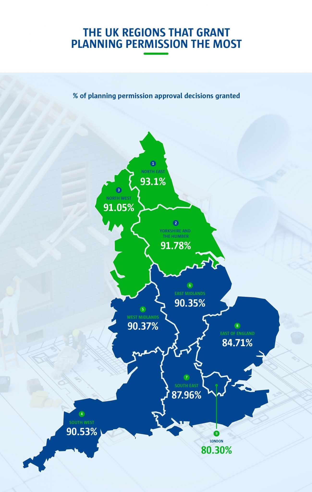 近日, Comparethemarket统计出了英国各地规划许可获批率较高的地区,我们一起来看看。