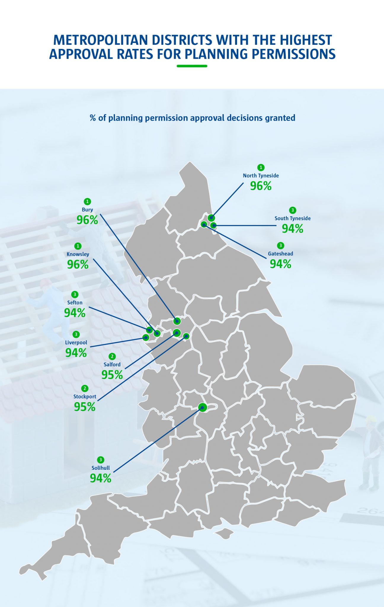 规划许可批准率最高的大都市地区如下:Bury – 96%;Knowsley – 96%;North Tyneside – 96%