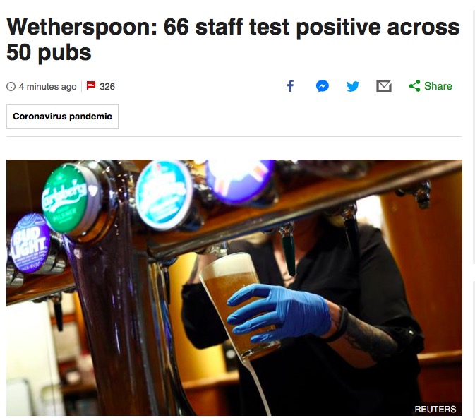 据英国BBC报道,英国餐饮连锁集团Wetherspoon的50个酒吧中,有66名工作人员确诊感染新冠病毒。