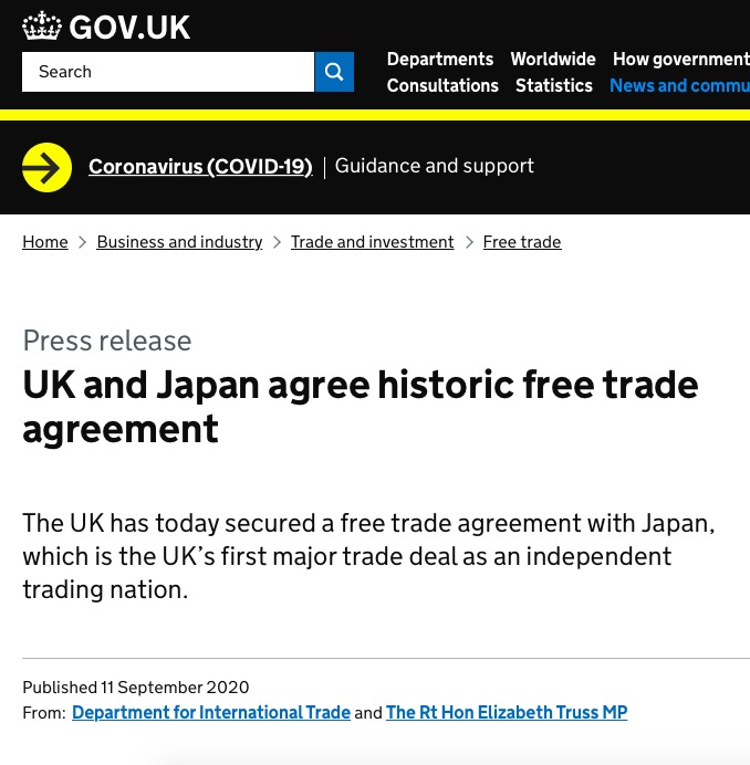 9月11日周五,英国贸易大臣Liz Truss和日本外相Motegi Toshimitsu举行了视频会议,并原则上达成了《英日全面经济伙伴关系协定》。