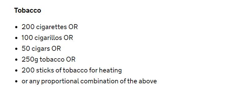 烟草产品的规定将保持不变,在规定范围内也无需缴纳关税。