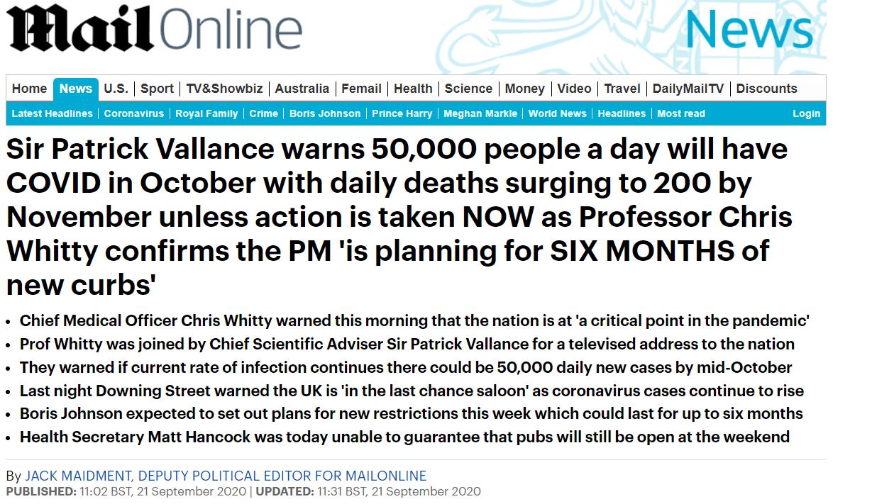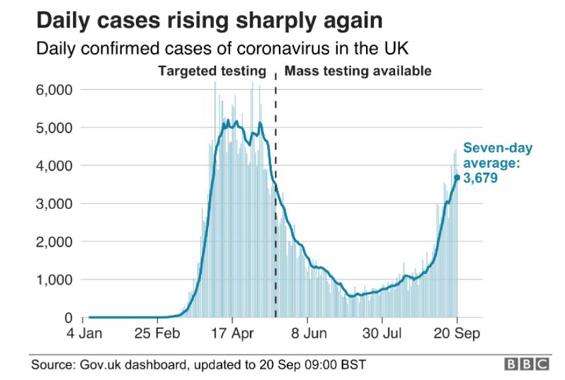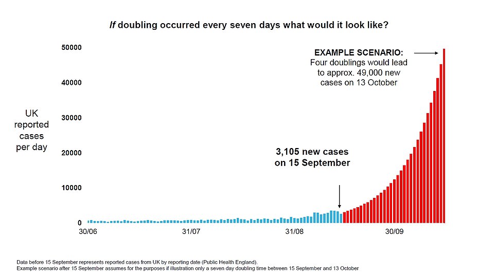 如果没有进一步的限制,按照目前的感染率持续下去,英国10月中旬每天就会有大约5万起病例。