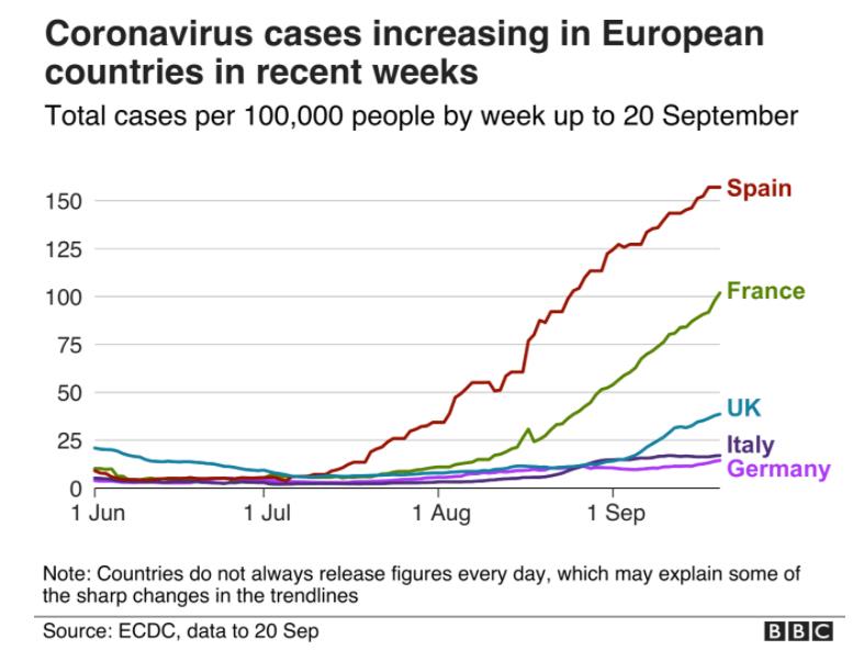 根据ECDC数据,截至9月20日,西班牙每10万人中的新冠确诊数已经超过了150例,而法国的这一数据也超过了100例。