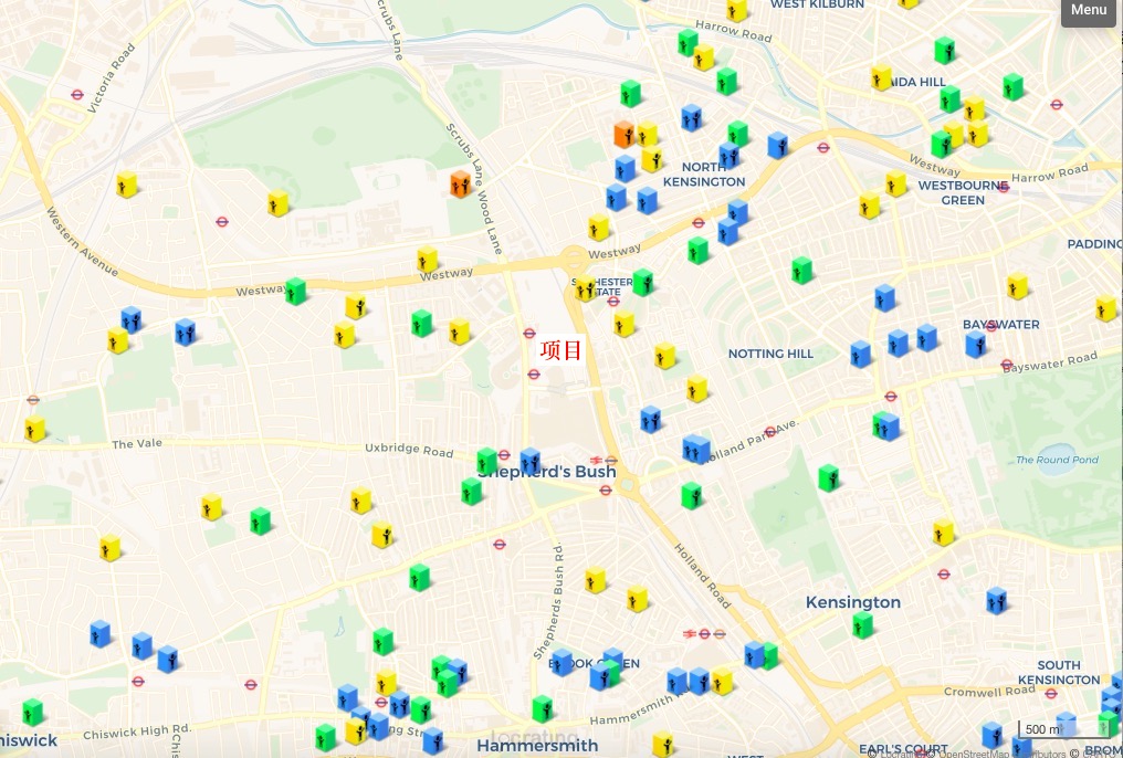 如下图所示:项目所在位置及蓝色的私立学校分布