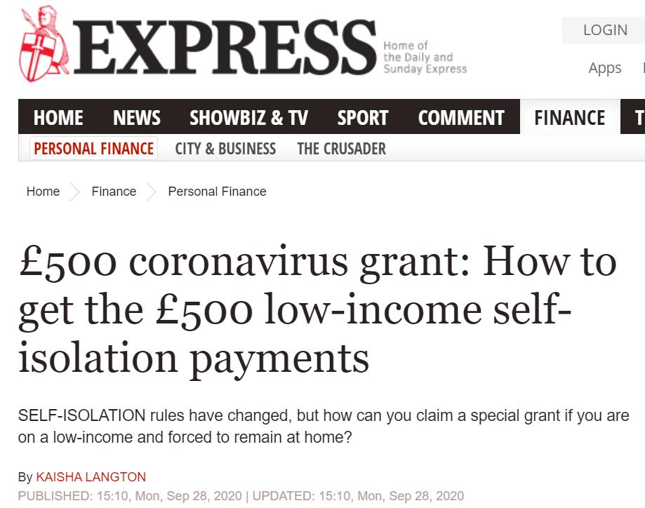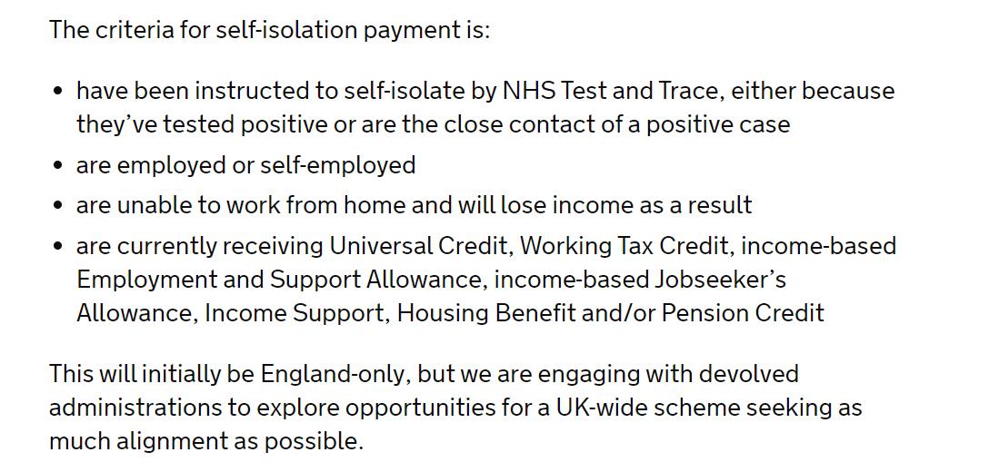 - 申请者的新冠病毒测试呈阳性或者是新冠患者的密切接触者,并接到NHS的通知要求进行自我隔离;