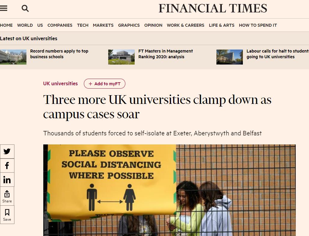 随着英国高校内新冠病例的激增,在本周一,至少有三所英国大学开始实施新的防疫措施。
