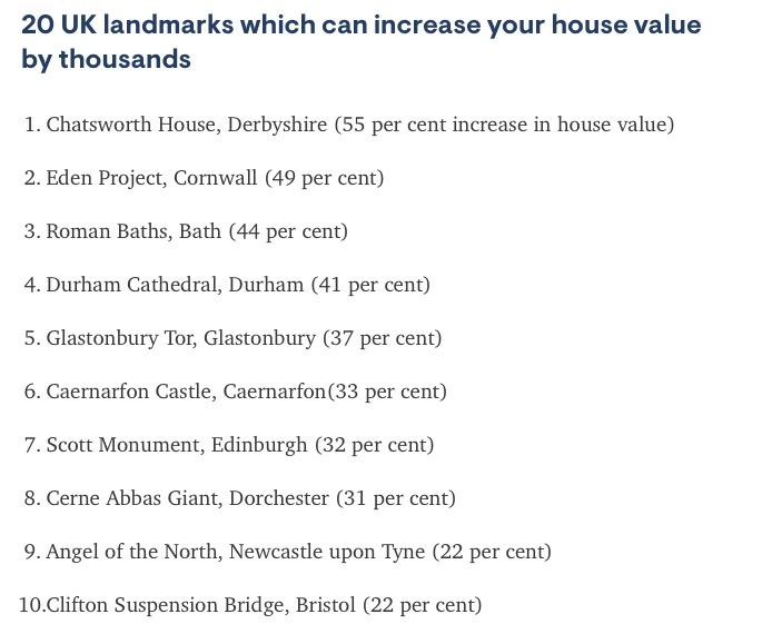 康沃尔郡的伊甸园项目是第二大可以让房产增值的地标,可以让房产增值49%。其次是罗马浴场(Roman Baths)排名第三(占44%)。