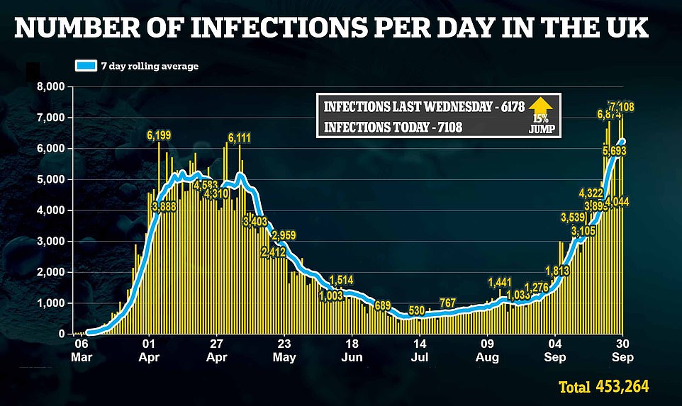 昨天,英国的新冠新增病例达到了7,108人,且连续两日确诊数都在7千人以上。