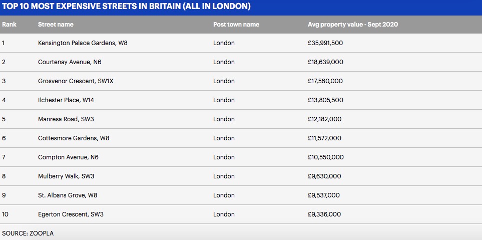 近日,Zoopla公布了伦敦最贵的十条街道。