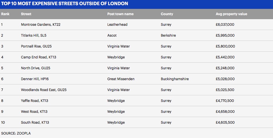 伦敦以外最贵的街道是萨里郡Leatherhead的Montrose Gardens,均价高达600万英镑。