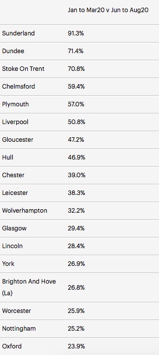 - 英国各地出现购房小高峰!房产交易量增加最大的地区是桑德兰(Sunderland),上涨91.3%。