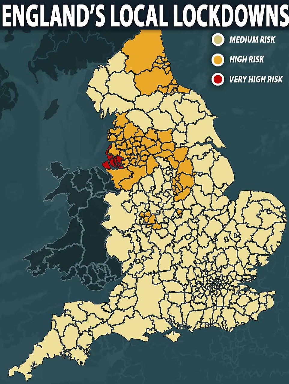 除了已经实施三级封锁的大利物浦地区,最优先考虑封锁升级的是大曼彻斯特和兰开夏郡。