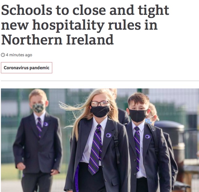 据英国BBC报道,为了控制疫情传播,北爱尔兰的学校将从周一开始停课(据悉学校停课两周,其中含一周万圣节的假期,也就是说只耽误了一周的课程,直到11月2日,会再次评估是否复课)。