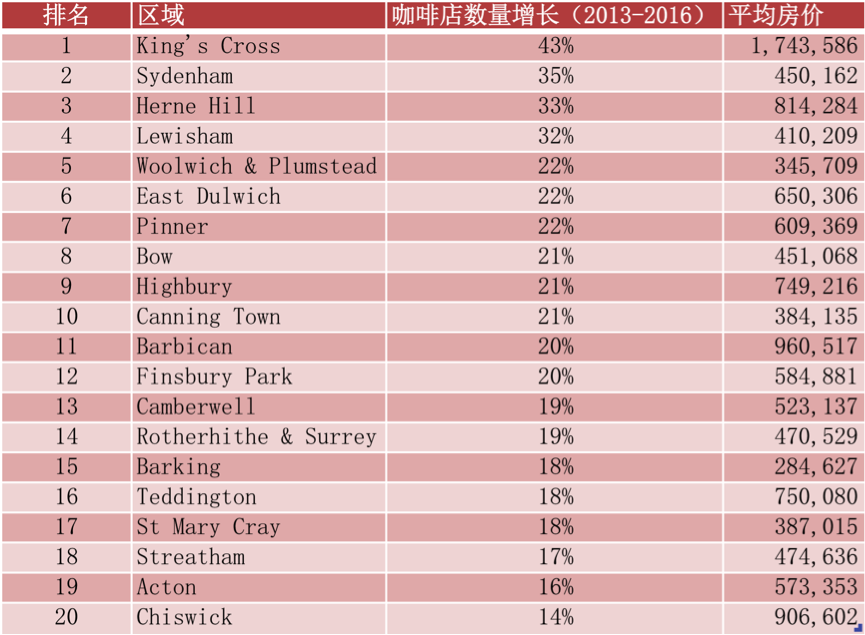 报告公布了伦敦最热门的20个咖啡店聚集区,并将这些区域的房价做了一个对比: