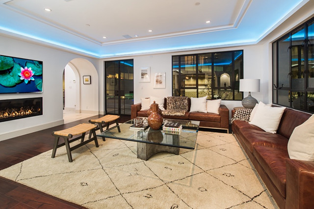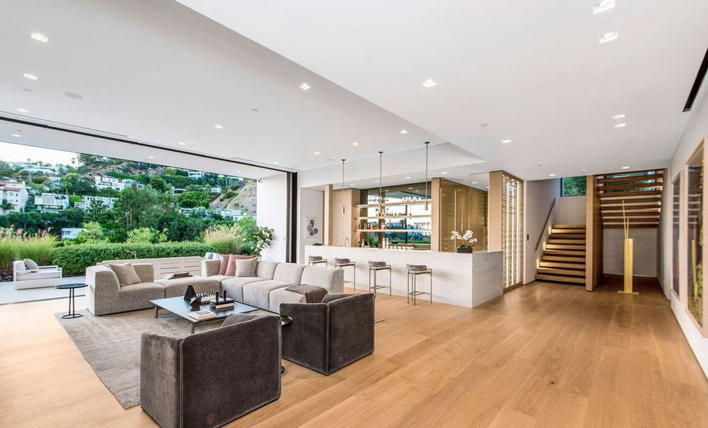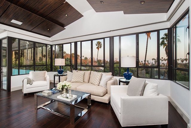 敞亮的客厅,拥有巨型落地窗,可以无死角的欣赏到好莱坞的美景。