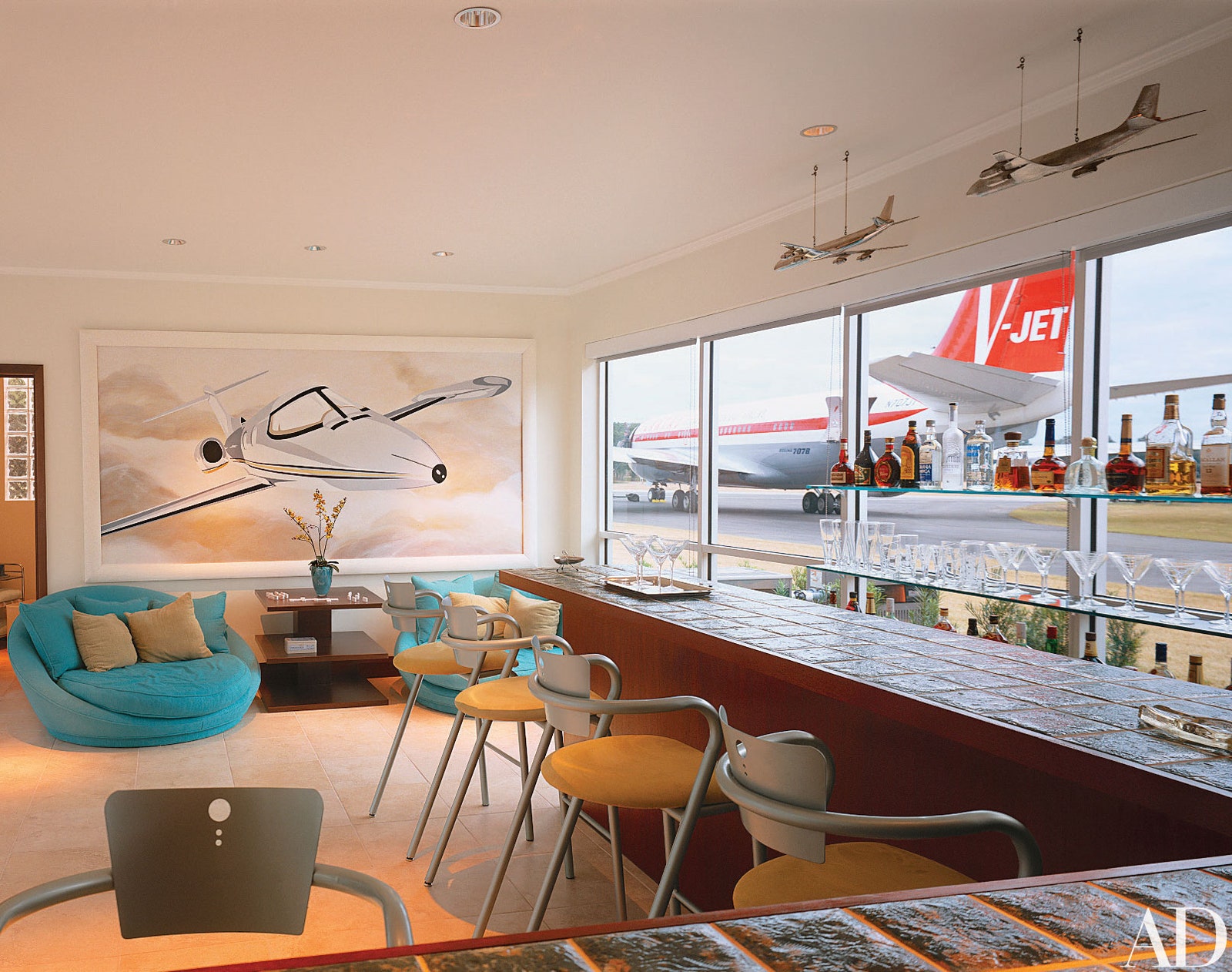 悬挂着飞机模型的吧台