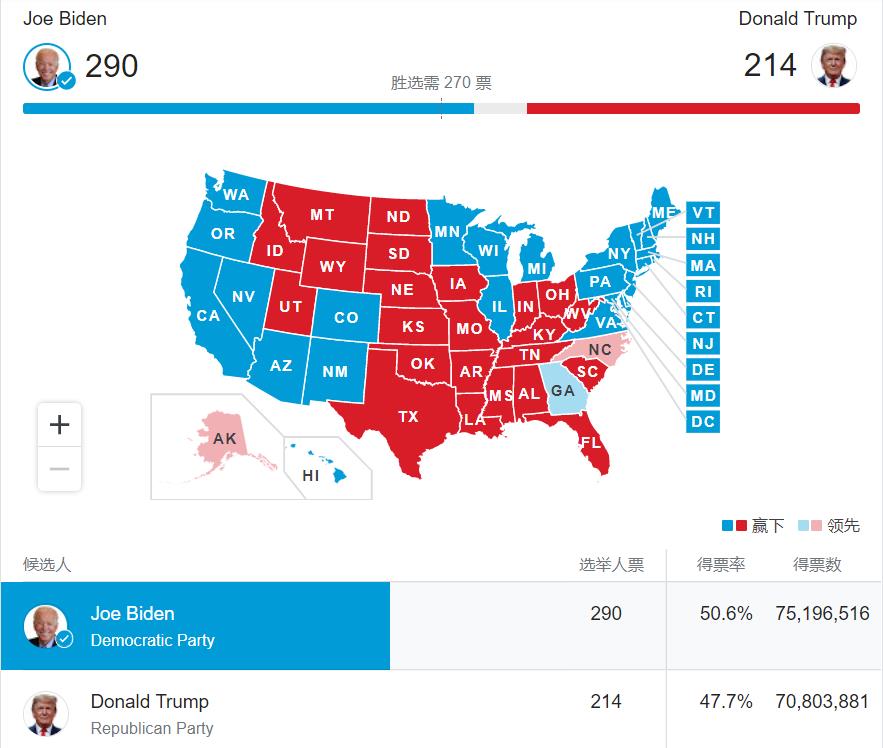 从目前的选举人票数来看,拜登以290票:214票的巨大优势,率先超过270票赢得大选。