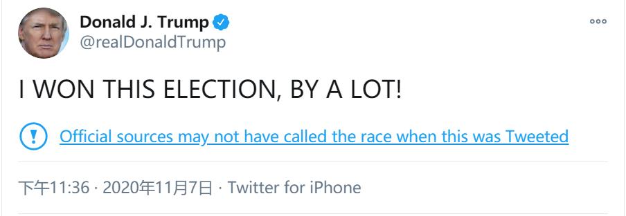 眼见于此,特朗普在推特单方面宣布:“我已经以很大的优势,赢得了这场大选!”